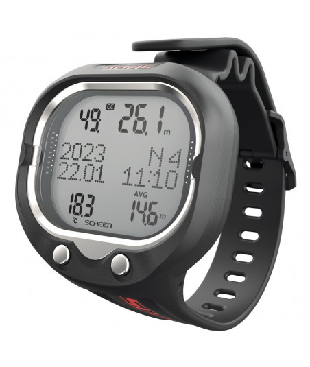 Seac Screen est l'ordinateur de plongée visant à la clarté et à la facilité de lecture de toutes les données relatives au profil de plongée. Le grand écran affiche toutes les informations pertinentes sur un seul écran, avec des caractères lisibles et distincts. Le contraste et la luminosité peuvent être réglés, ainsi que le mode (automatique ou manuel) et le temps d'éclairage arrière (de 2” à 60”).Les mesures d'affichage sont de 4x4,7cm et celui-ci est protégé par une coque solide recouverte de caoutchouc. Dimensions cadran 6,7x7cm. La sangle est longue et conçue pour attacher le Seac Screen même au-dessus d'une combinaison étanche. Longueur totale, à l'extrémité opposée de la boucle: environ 36 cm.