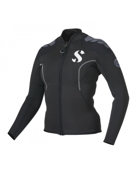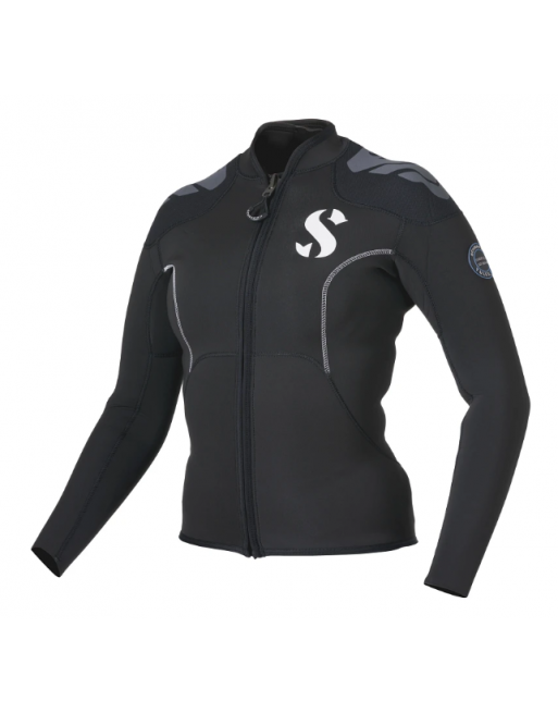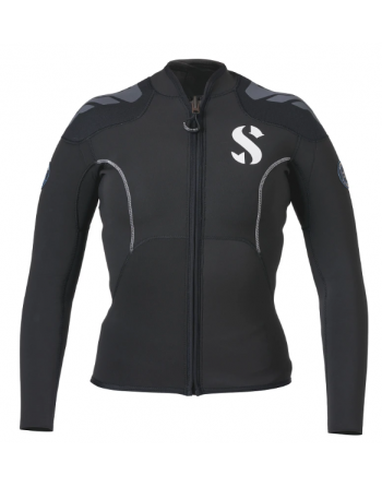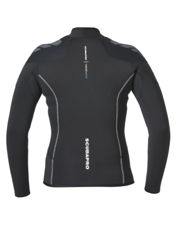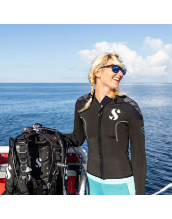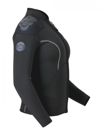 Le haut est muni d’une fermeture à glissière verticale frontale tandis que ses poignets sont dotés de manchons découpés à chaud et ultra-élastiques pour un enfilage aisé. Le haut est quant à lui pourvu de textile résistant à l’abrasion et de renforts imprimés sur les épaules pour le protéger des frottements avec le gilet de stabilisation.