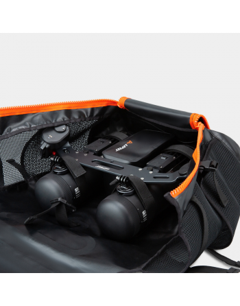 Le pack contient : une turbine, une platine simple, une télécommande, une poignée, une batterie, un leash, une fixation GoPro, un joint, un chargeur de batterie lithium ion, un chargeur de télécommande.