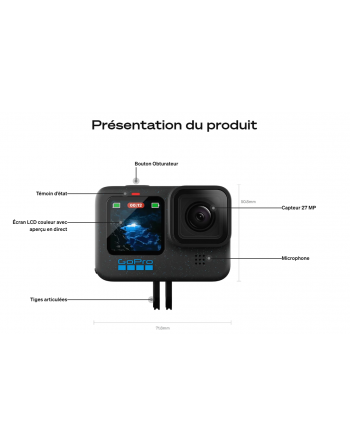 Résolutions vidéo 5.3K60, 4K120 et 2.7K240. Stabilisation vidéo HyperSmooth 6.0 avec verrouillage de l’horizon à 360°. Grand capteur d’image permettant d’enregistrer un champ de vision ultra-grand-angle de 156° au format 8:7. Photos de 27 mégapixels, avec possibilité d’extraire des images de 24,7 mégapixels à partir des vidéos. Étanche jusqu’à 10 m et durabilité légendaire de GoPro