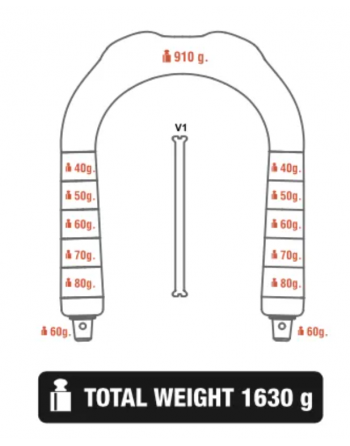 Le collier est fabriqué en plomb recouvert d’une couche de caoutchouc thermoplastique confortable. La partie principale pèse 910 grammes et peut être personnalisée avec 5 poids en plomb interchangeables de chaque côté (40, 50, 60, 70 et 80 grammes), permettant d’atteindre un poids total maximum d’environ 1 630 grammes, composants métalliques inclus. Ces poids en plomb peuvent être facilement remplacés par des pièces légères en plastique, réduisant le poids du collier à seulement 1 kg.