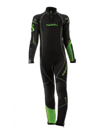 Une petite fermeture à glissière au niveau du cou permet d’accroître l’aisance en surface. Les panneaux en néoprène extensible renforcent la mobilité et l’aisance. Genouillères renforcées pour éviter l’abrasion sur les jambes de la combinaison et du plongeur à genoux.