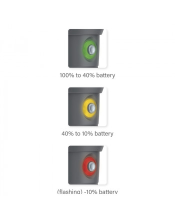 L'interrupteur est doté d'un anneau circulaire lumineux qui s'allume en vert lorsque la batterie est chargée, en jaune lorsque la batterie est à moitié chargée et en rouge clignotant lorsque la batterie est faible.